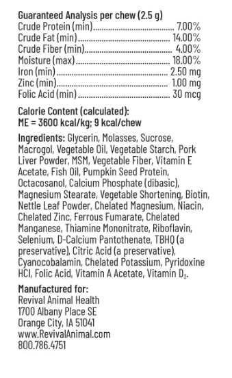 Glycerin, Molasses, Sucrose, Macrogol, Vegetable Oil, Vegetable Starch, Pork Liver Powder, MSM, Vegetable Fiber, Vitamin E Acetate, Fish Oil, Pumpkin Seed Protein, Octacosanol, Calcium Phosphate (dibasic), Magnesium Stearate, Vegetable Shortening, Biotin, Nettle Leaf Powder, Chelated Magnesium, Niacin, Chelated Zinc, Ferrous Fumarate, Chelate Manganese, Thiamine Mononitrate, Riboflavin, Selenium, D-Calcium Pantothenate, TBHQ (a preservative), Citric Acid (a preservative), Cyanocobalamin, Chelated Potassium, Pyridoxine HCl, Folic Acid, Vitamin A Acetate, Vitamin D3.